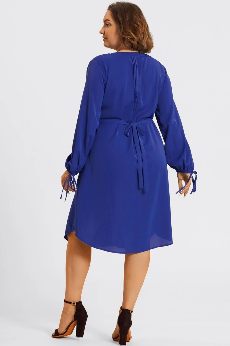 - With pleats that fall gracefully from the waist, and a V-neckline that ends in a knot, this dress goes from desk to dinner or a special event with ease. Which can be accented with a string of pearls and slingback heels. Swap out your accessories and take this plus-size dress from workwear to date night in a snap.